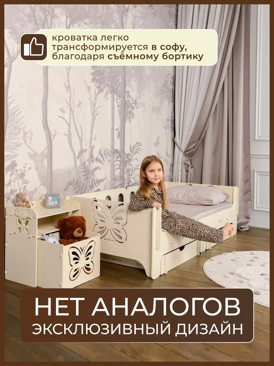 Конструкция трансформер легко превращается в приставную подростковую софу, ее защитные борты можно установить на одну сторону.