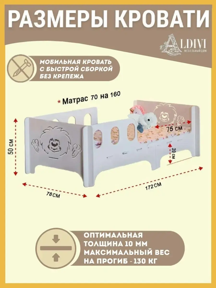 Компактная деревянная кроватка в детскую сделана натуральной фанеры, качественно обработана, имеет закругленные углы. Невысокая, поэтому на нее комфортно залезать и слазить самостоятельно.