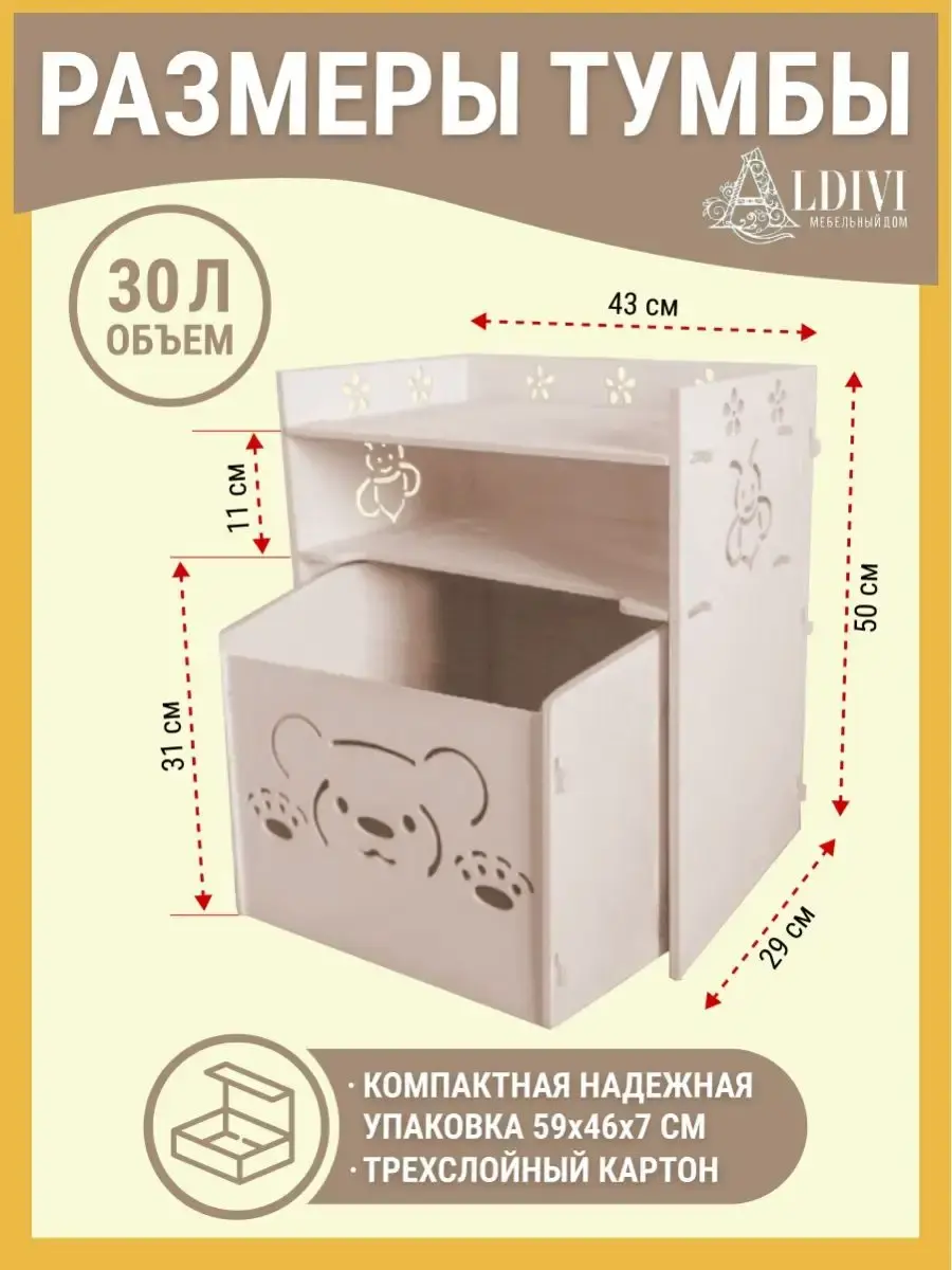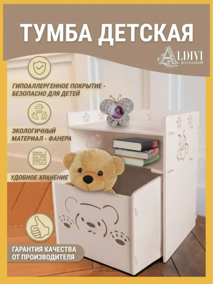 Детская мебель ALDIVI - тумбочка в детскую предназначена для удобного хранения. Прикроватная детская тумба для детей "Мишка" или "Бабочка" вмещает в себя многие вещи. Тумбочка идеально подходит под детские кроватки ALDIVI, в которых могут спать и отдыхать совсем малыши 3-5 лет, мальчики и девочки возрастом 6-8 лет. Тумбочка ALDIVI имеет гарантию от производителя и не уступает по качеству мировым брендам. Детская тумбочка прикроватная изготовлена из экологичного материала - фанеры. Гипоаллергенное покрытие. Безопасно для детей, украшение детской комнаты, удобное хранение. В комплекте вы найдете подробную фото инструкция с картинками и ссылку на видео сборку. Если у вас все равно возникнут сложности или останутся вопросы работает служба качества, которая всегда поможет в решении любых проблем. Качество нашей тумбы не уступает качеству ikea / икеа. Имеется выдвижной ящик, который выдерживает до 50 кг. Надежная упаковка товара обеспечивает сохранность при транспортировке. В нашем каталоге Вы можете купить другие товары для детей этой коллекции, созданные в такой же технологии. У нас вы найдете —кроватки, стеллаж и ящики для игрушек, стол для рисования, стульчик. С уважением, МД Альдивы.