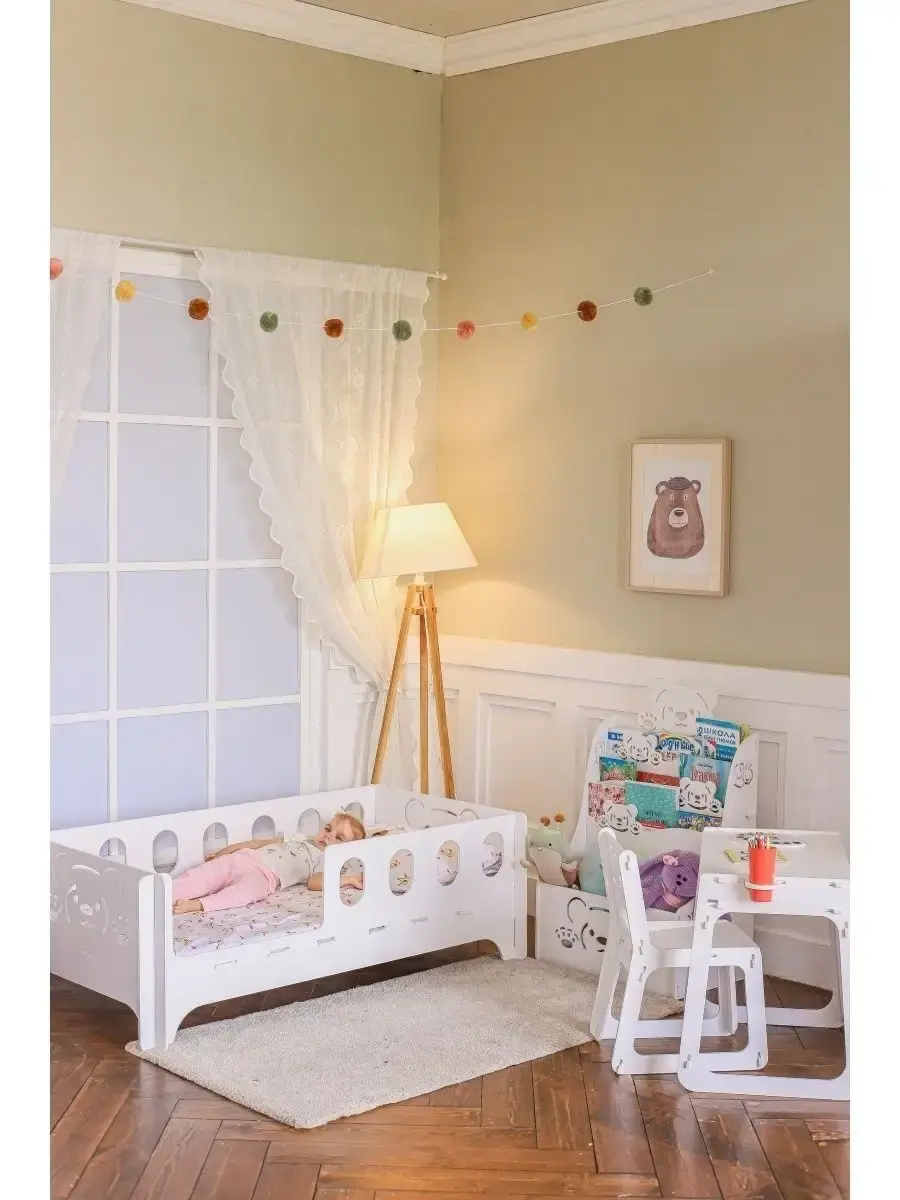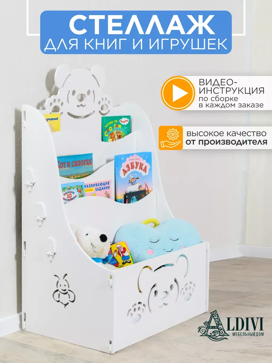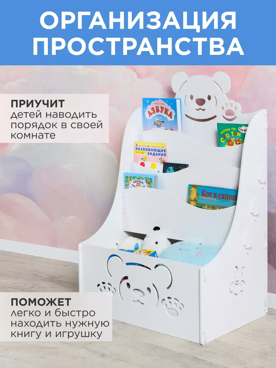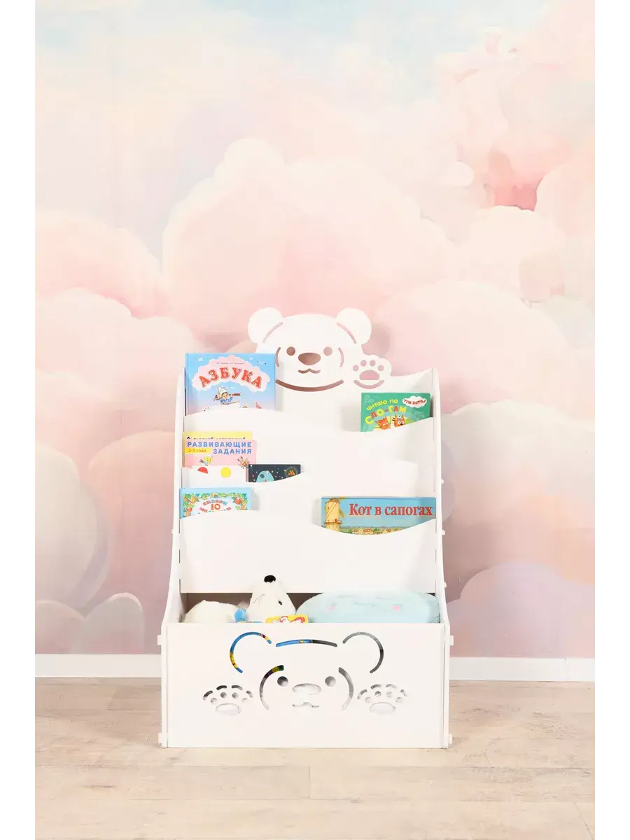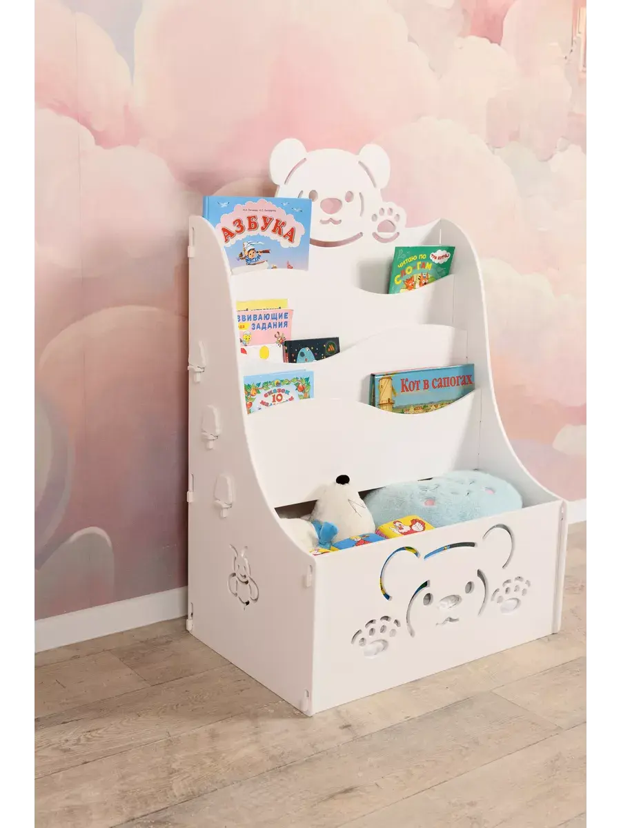 Стеллаж детский "МЕДВЕЖОНОК" на колесиках отлично подойдет для использования в детских комнатах, дошкольных учреждениях и школах. Стеллаж покрыт абсолютно не токсичной белой акриловой эмалью на водной основе, поэтому безопасна для малыша. Особенностью данной эмали является и то, что она очень устойчива к повреждениям и легко очищается, имеет первый класс стойкости к истиранию. Каркас изготовлен из прочной и экологичной фанеры. Конструкция очень легко собирается в домашних условиях без использования инструментов и крепежных материалов. Это обеспечивает хорошую прочность и устойчивость стеллажа. Полку можно использовать для хранения книг и игрушек, а красивый дизайн и резные узоры подойдут к любому оформлению помещения и будут интересны малышу. Для нас очень важно быть в тренде, мы стараемся включать в свои премиальные коллекции самые современные модели изделий из качественной фанеры. В нашем каталоге Вы можете купить другие товары для детей этой коллекции, созданные в такой же технологии. У нас вы найдете — кровати детские, тумбы прикроватные, стеллаж и ящики для игрушек, стол для рисования, стульчик. С уважением, МД Альдивы.